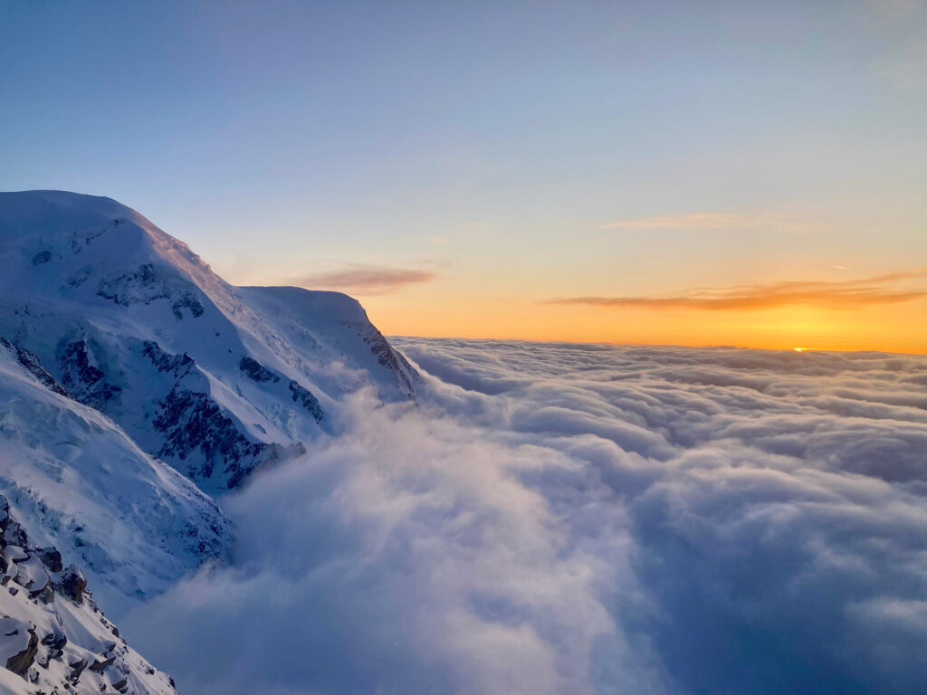 Matériel d’alpinisme : crampons, piolet, baudrier, corde, dva/pelle/sonde (si besoin), broches, longes, mousquetons,… parce que tomber dans une crevasse, c’est pas drôle.
